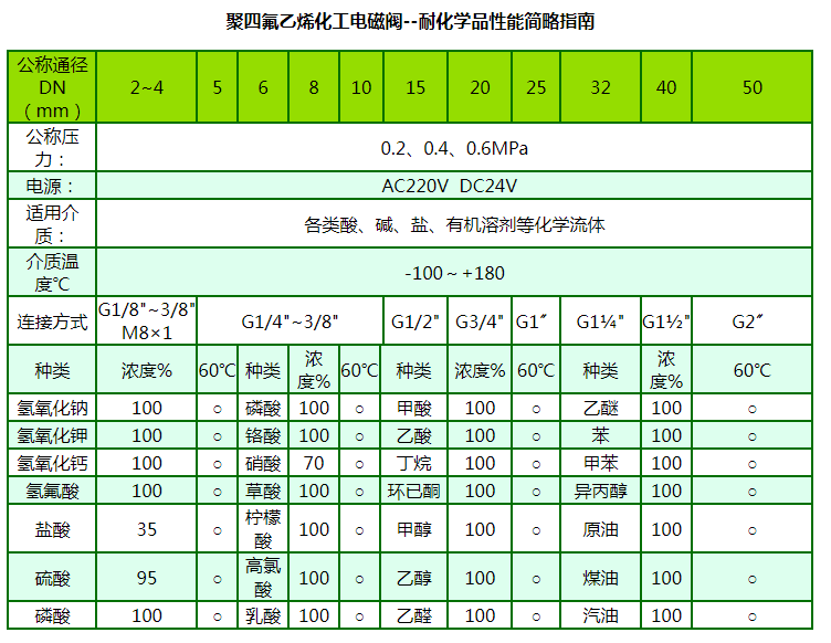 聚四氟乙烯化工电磁阀具有优异的耐腐蚀性能,对所有的常用化学品都呈惰性。几乎可以抵抗所有化学介质(包括浓硫酸和王水)。具有优异的耐热性能,应用温度为-100~180℃,材料可长期在230~260℃下工作。特别适合腐蚀严重、温度高且化学品不允许与润滑剂接触的环境。